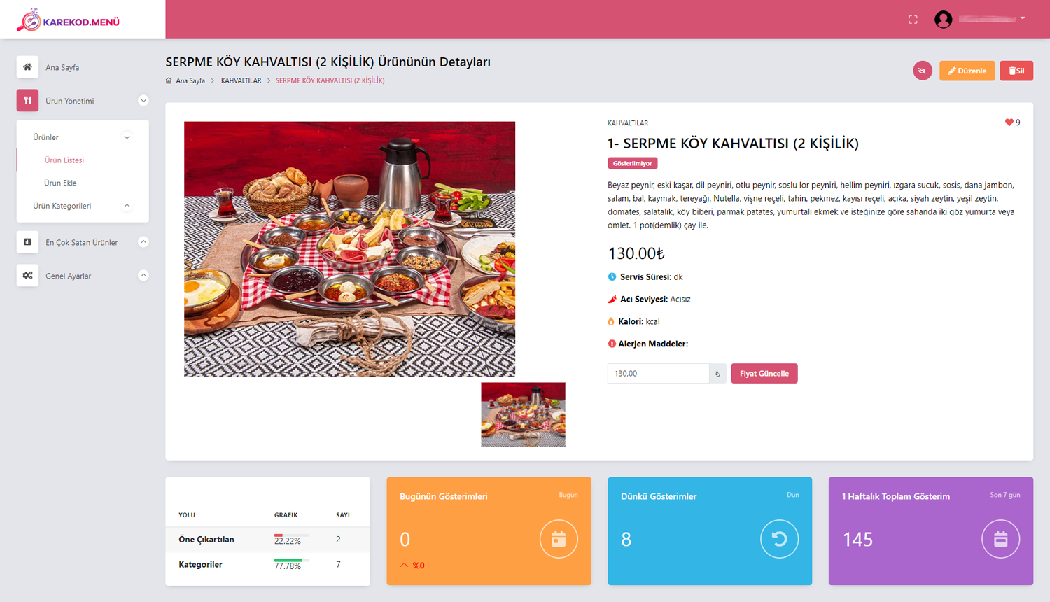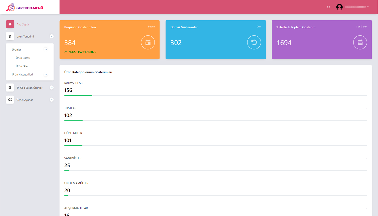 Karekod Menü™ yönetim panelinden tüm ürünlerinizin günlük, haftalık ve aylık olarak görüntülenme istatistiklerini detaylıca görüp ürün yelpazenizi kârınızı artıracak şekilde genişleteceksiniz...